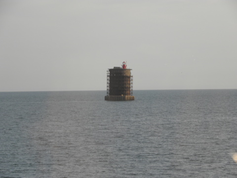 | Thankfully I ended up with a rather pleasant distraction as Oceana came into view through the window as we neared the Leaning Tower of Nab (which was doing a very good job of being upright).  Juanita had an easier view than me, since the ship was behind me, so I've left the photos exactly as taken to show how difficult it was getting them at that angle and then with the sun in my eyes. |