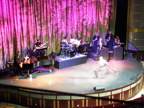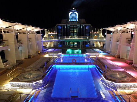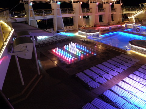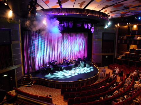 | We decided to go to the second show at 8.45pm called Welcome Aboard Entertainment Extravaganza.  Our cruise director was Nick Weir, probably best known to UK passengers as the bloke who replaced Roy Walker on Catchphrase.  I knew the face but couldn't think where I'd seen him before.  The video ship footage was Solstice, which was so obvious with that stuck on X.  Nick came on singing and was very good.  But even he said Solstice!  Turned out he'd come over from that so perhaps he'll go to Eclipse.  The show itself was a small preview of the music they have such as the Ukranian girl four-piece Inspirational Strings, A capella group Sound Decision and a short excerpt of the show to be performed two nights later. |