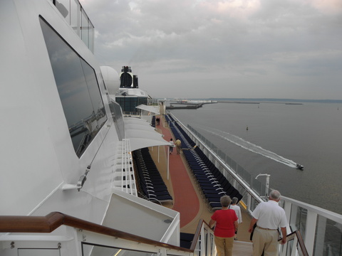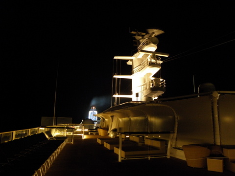 | I went up for our 9pm sailaway and we were already on the move by the time I got up there.  Disappointingly, for a maiden call, nothing was going on to mark it!  A few people turned out and there was a little pilot boat which parped at us so we blasted back but that's all. |