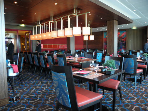 | The meal itself was a bit of a disaster which shouldn't have happened after all the preview cruises as well as the previous one.  It all took ages to come at all!  Juanita ordered a shrimp cocktail but rather than cocktail sauce, was gived a small teaspoon's worth of tomato sauce!  I was glad I hadn't ordered it.  I made prawn cocktails in a hotel kitchen and you don't put peppers in the salad.  I'm increasingly pissed off with peppers in so much, even things which it's not meant to be in.  RCCL is the WORST for this, and getting worse each year.  I'm allergic to them, people don't like them and they DON'T list them on the menu.  Meanwhile for the main course I'd ordered a steak well done (at least you can have it like that on Celebrity whereas RCI it's up to medium-well done if you're lucky unless in a speciality restaurant) but not given a steak knife. |