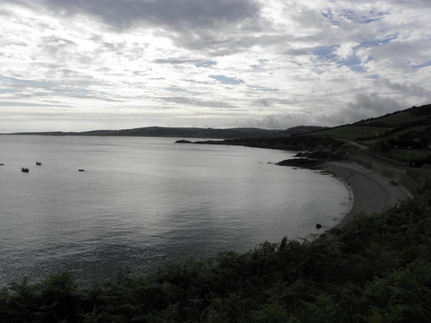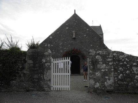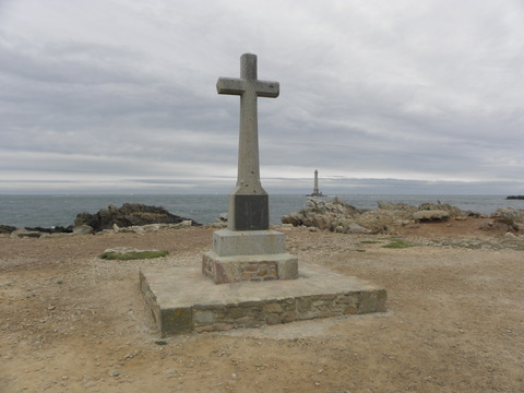 | The next stop was to Goury.  Several people went to the toilets which weren't that great, as Dominic had warned.  I kept watch for a lady because there was no light so the door needed to be ajar, then she did the same for me.  She said if she could go in China she could go anywhere.  We saw the lifeboat then were able to have a wander for about half an hour.  In the miserable distance near the lighthouse was Alderney. |