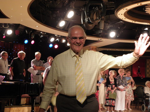 | Marge and Cedric had given their first performence in Carmens and we were all going to the second at 8pm. During dinner it was announced the show, Blame It On The Boogie, was cancelled due to technical difficulties. We heard the rehearsal so no wonder! Instead Lee Wilson, who they say is a comedian, was on instead. Bugger that. Anyway, Cedric was delighted with the extra bowl of strawberry compote Savio gave him with his dessert. Strawberries were few and far between sine the early days. We think Cedric ate them all! |