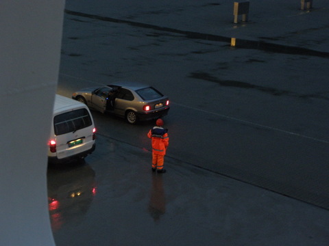 | As we were being tied around 7am, there was a Code Alpha on A deck in cabin 135. I really hoped this rain would piss off and cloud disperse. The Deputy Captain's clearance spiel said there was a chance of showers. Oh for open bridge wings then he could stick his hand out! Where the hell were they getting this from? They had been wrong ALL cruise and continued to be so. I think everyone would drop dead from shock if they got it right. I went back to the cabin afterwards to sleep since Costa Deliziosa wasn't due until 10am and Marina for the revised time of 1.30pm-5pm, instead of 8am-12pm. I heard Agostino's assistant say my name as I passed. When I woke up at 10am, I put the webcam on and saw a blurry white blob in front of us - damn! It was still pouring so I stayed on the Prom deck as Marina turned and backed up, disappearing from sight unless I went up or across to the land. The Costa then sneaked around the corner, anchoring ahead of us - cheek! |