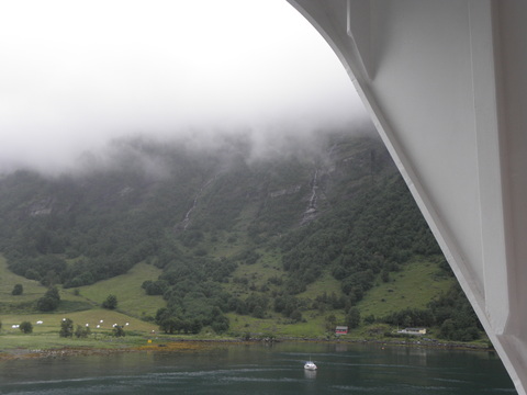 | Well I was naughty and reset the alarm since I thought we had plenty of time and I was knackered. When I went on deck we weren't that far away - bugger! Missed the Seven Sisters yet again! Last time I was there in June 2008 was on the QE2 on what was the BEST cruise EVER! I was also extremely hungover after Bergen Night and hated Geiranger. Mind you, back then we had DRY weather unlike today which was pouring, cold and windy with very low cloud. |