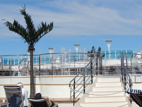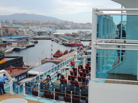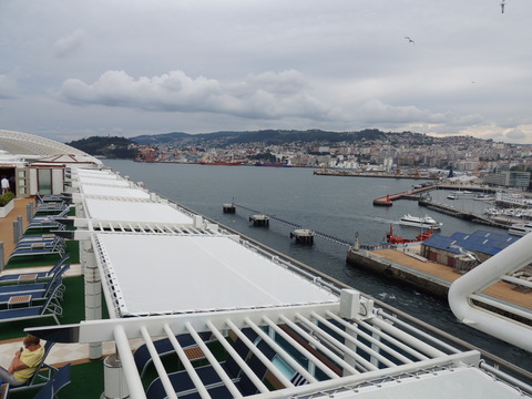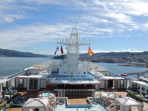 | Vigo and it was like the Mary Celeste at 10.30am when I got up due to the crew drill. It was hot outside but nice. I decided to try a cheeseburger from the Trident Grill. There was an awful racket coming from the dock and thankfully, fountain practice drowned it out periodically! Afterwards I went outside for photos. I asked the security guard if I could go to the end to take pictures of her bow and was told no, it's too dangerous with the ropes. Was he related to that twat in Bilbao in 2012 who said I couldn't of Constellation or Hobart when he said about ropes of Radiance of the Seas? I pointed out they let you on QM2, Independence of the Seas and others to which he replied, "Not the same company." Cunard is, you pillock, and once upon a time Princess used to manage them! Pity I didn't remember Grand up our bum on Mary in 2011 but he was such a jobsworth I just left. Outside, the racket turned out to be a government protest due to them capping withdrawals from banks or something, as Cyprus had done. Here's a radical idea - stop throwing endless money down the toilet to prop this failing currency up, get out of it and regain control of your own finances. Air horns and Vuvuzelas made such a tuneless noise. I went back on after bumping into Matt and Mark. Had a chicken sandwich at the International Cafe in the Atrium and Dot found me there. Later I spotted Ron in Horizon Court and we joined Dot on deck for a natter. A quick pop back to the cabin before sailaway. At least the info channel was working, even though it still insisted we were at sea, but the weather was still the same. |