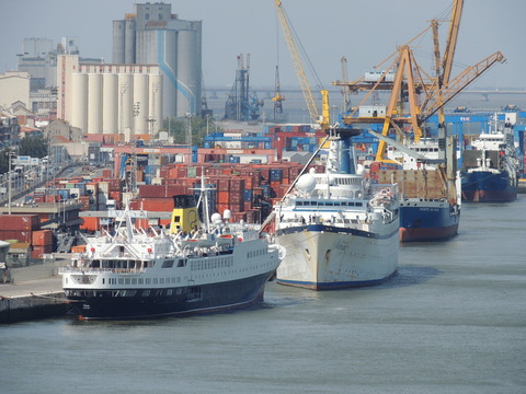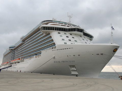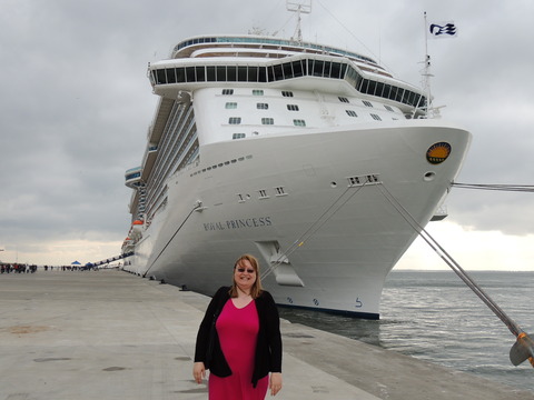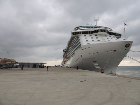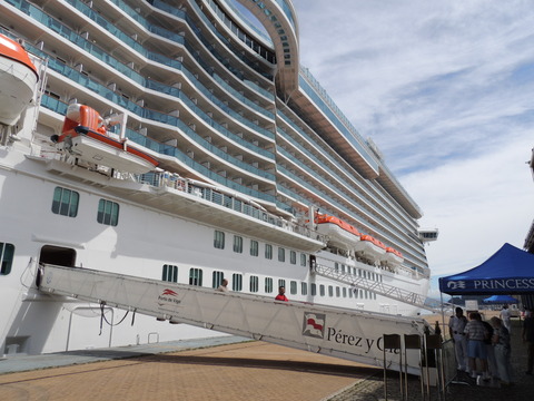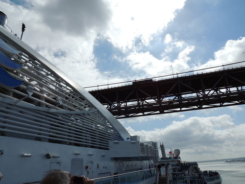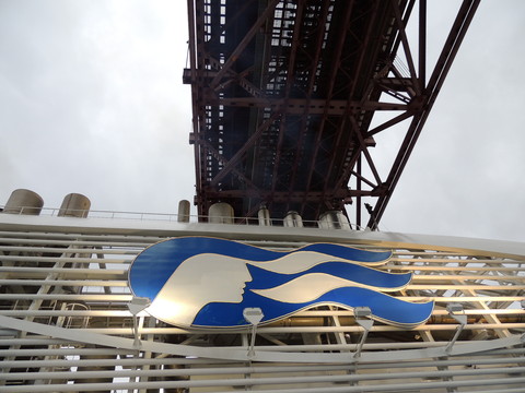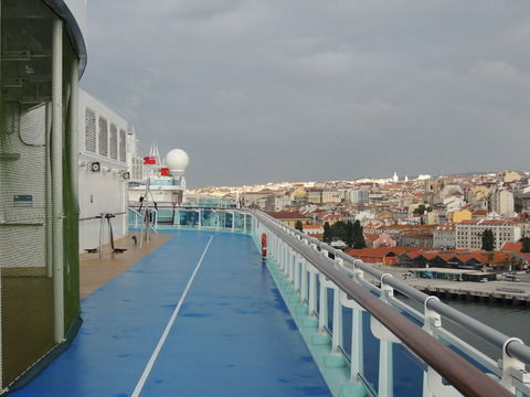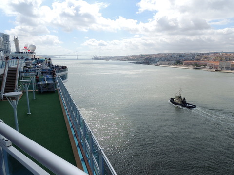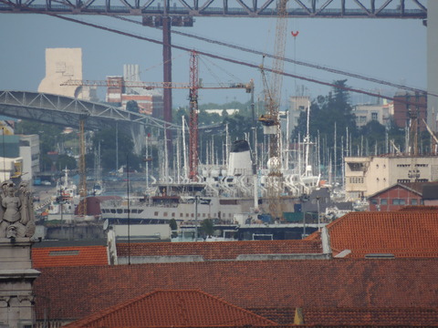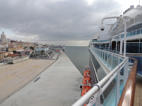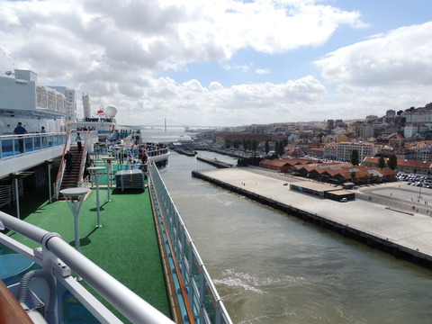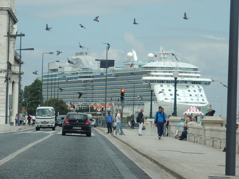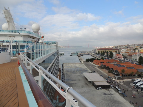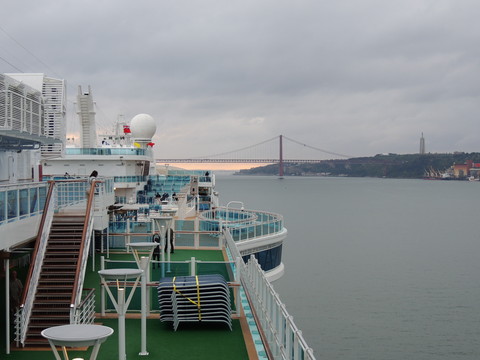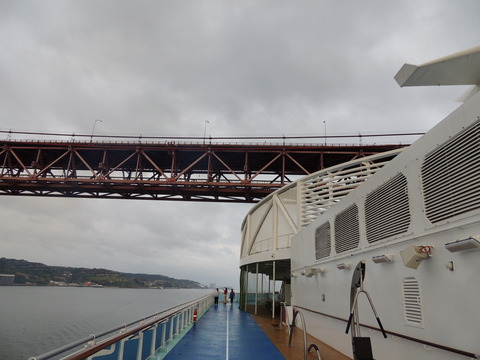 | Lisboa! I hadn't been able to do much due to my back during my previous calls, but I just love sailing into this beautiful port. Unusually, instead of turning just after the bridge, we continued along the Tagus and I saw cargo ships where we would have been. Instead we were docking at the other terminal, where I had seen Columbus 2 in 2012 from Independence of the Seas. It certainly offered better scenery, although I missed being right by the bridge. A bit further along were two ships, the recently renamed Porto and Lisboa (which still had Princess Danae on the bow). Funchal, which had been there since 2010, was currently in dry dock. After breakfast I decided to go went for some photos and walked through Club 6, which is such a lovely room during the day and one of few with windows. Outside, no jobsworth security guard stopped anyone. It is a really nice dock though strange after being used to the other. Then back on as I was awaiting a phone call from author, Luis Miguel Correia, who was visiting the ship that day. My Facebook friend, Vitor Francisco, had known Luis a long time, mentioned I would he on the Royal Princess and hadn't seen Funchal during my previous calls to the city. Luis offered to take me to see her. As it turned out, I was say on deck 16 talking to Ron from my table when a small group of visitors appeared. I wasn't sure if Luis was among them but he came back (as ship nuts do if they get the chance) so I guessed and he came over. We arranged to meet on the dock at 2pm then off he went back on his tour. |