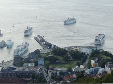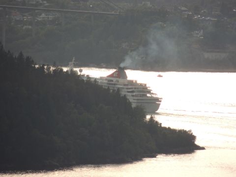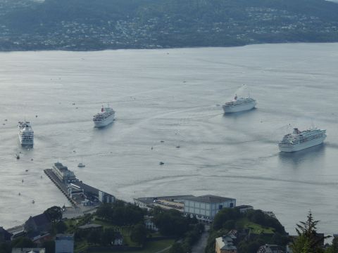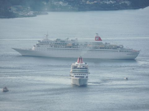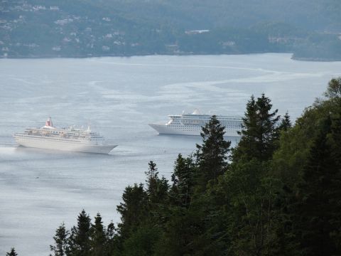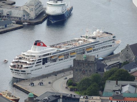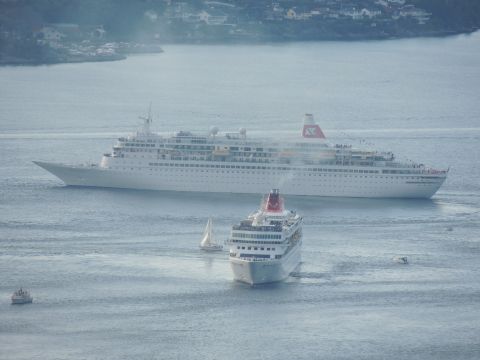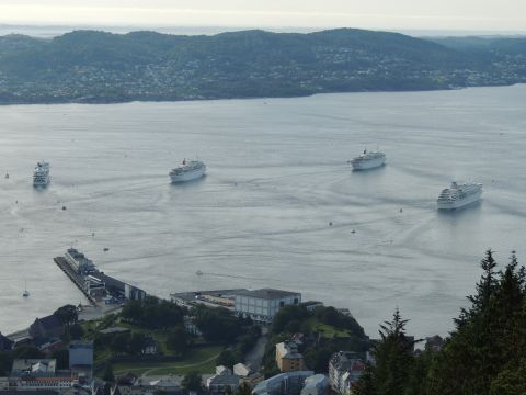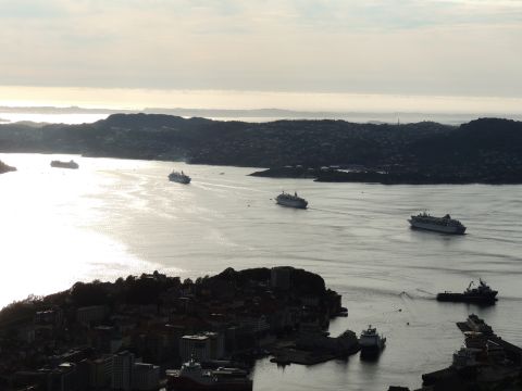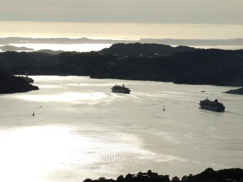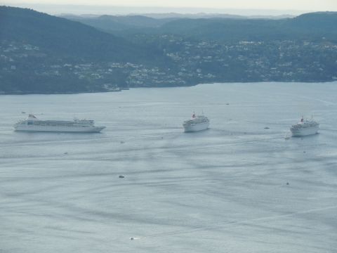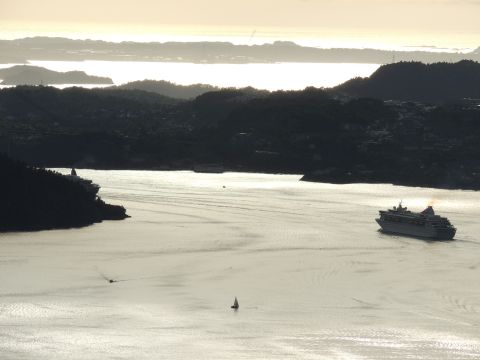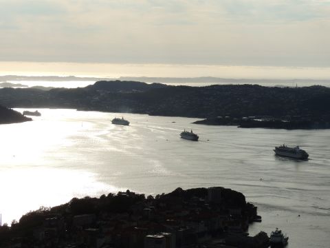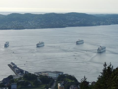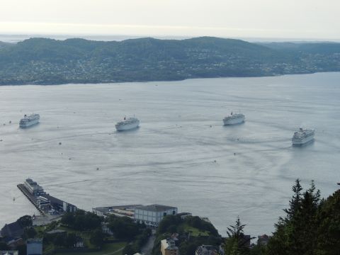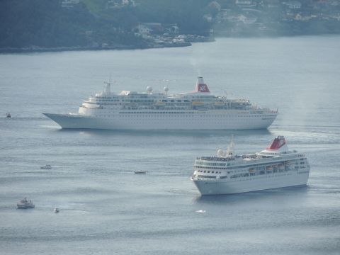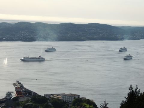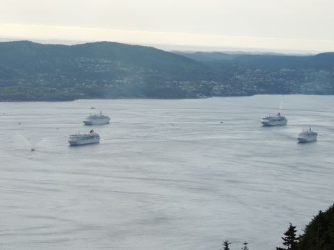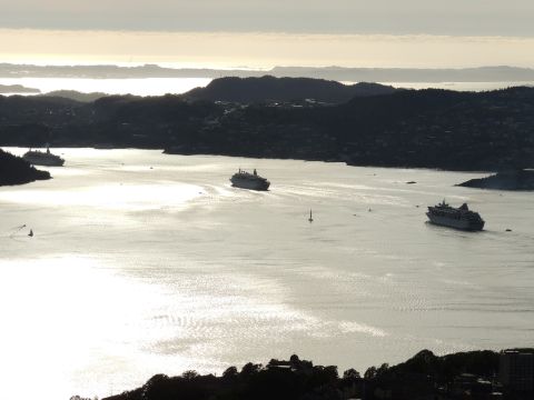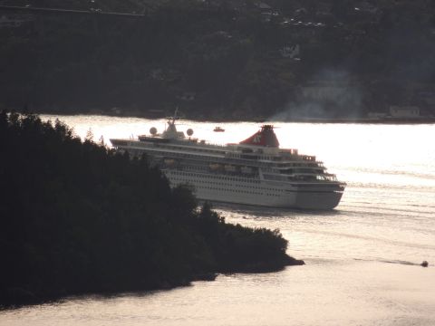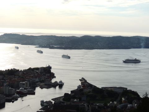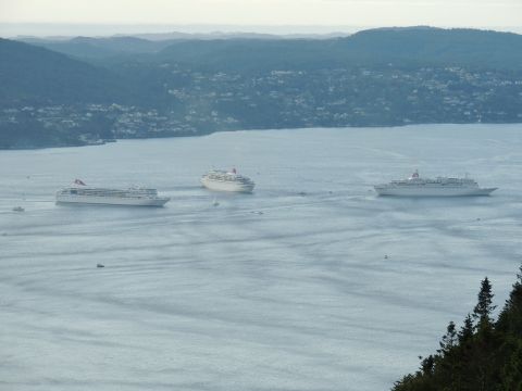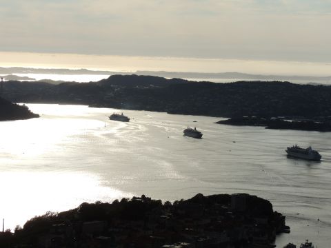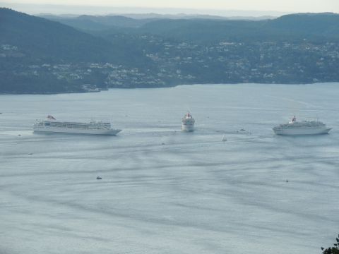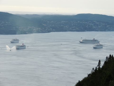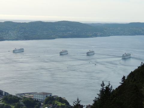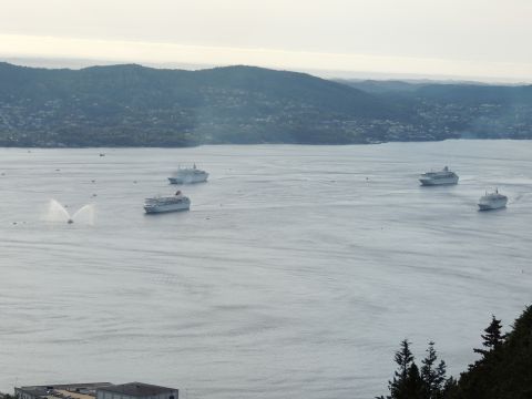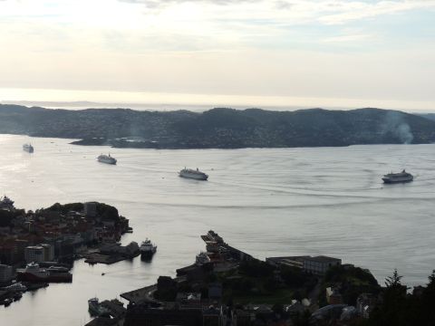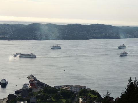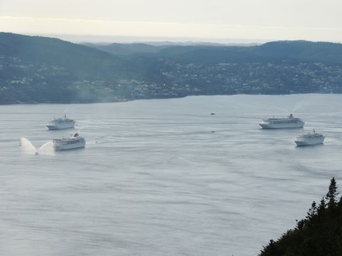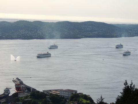 | After a couple of hours back at the hotel to charge batteries, it was time for get ready for the departures and up to Fløyen via the Fløibanen funicular. I have a fear of heights so am very proud of myself for doing that. A few people were there for the ships but most wanted the view then left. It clouded over but thankfully there was no rain. They were all due off at 6pm, Boudicca casting off first followed by Balmoral, Black Watch and Braemar with them sailing abreast to around 1.5 nautical miles north of Skolten. One bloke had gone by this time, whether to get another view or because he thought that was it, I have no idea. I lost sight of Balmoral for a while due to trees but she re-emerged as they turned to make the diamond formation behind a fireboat. Braemar then led them out, Boudicca, Black Watch and Balmoral behind. The flagship blew her horn as she passed the port of Bergen as one by one they sailed towards the Askøy Bridge about 12 hours after arriving under it. |