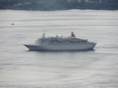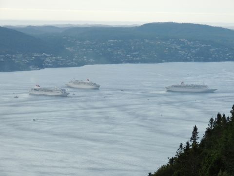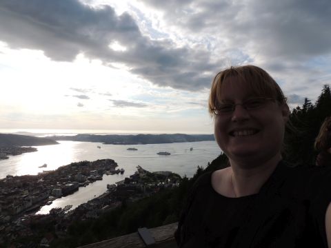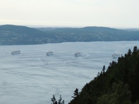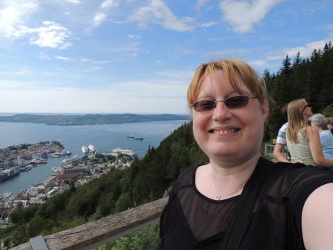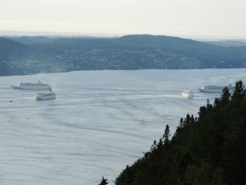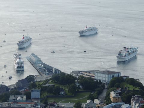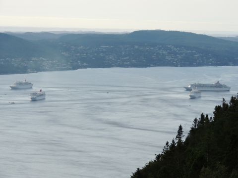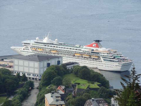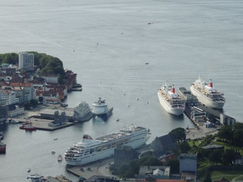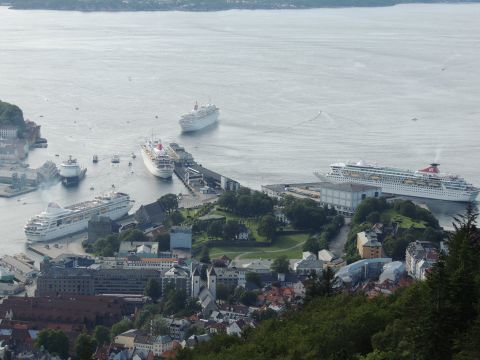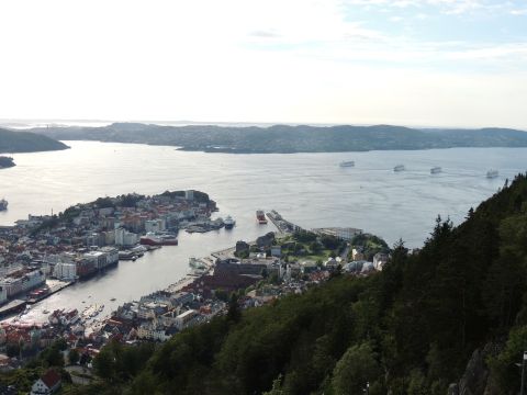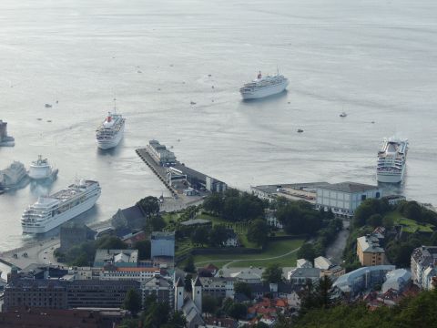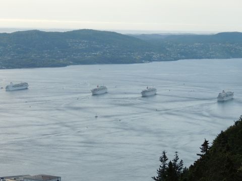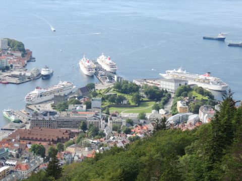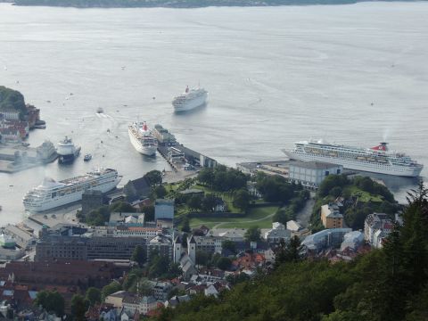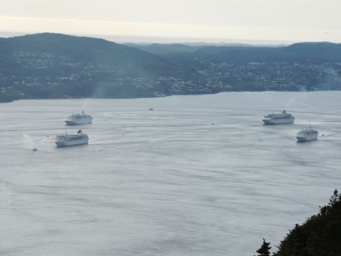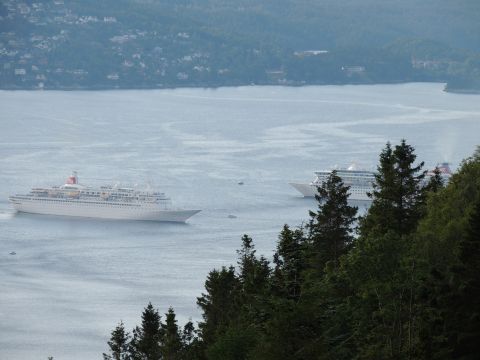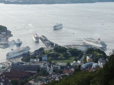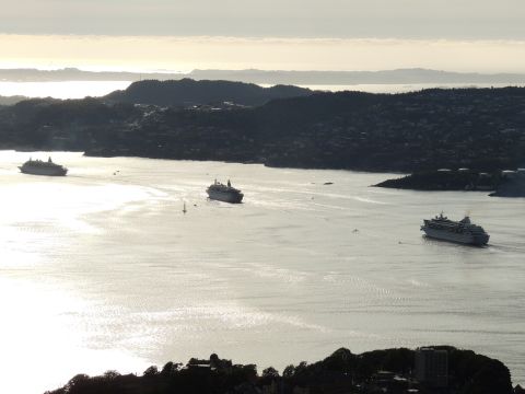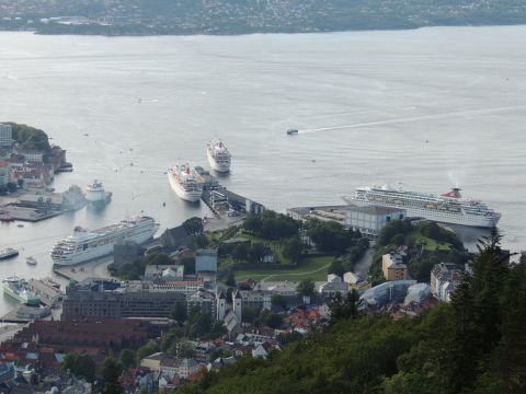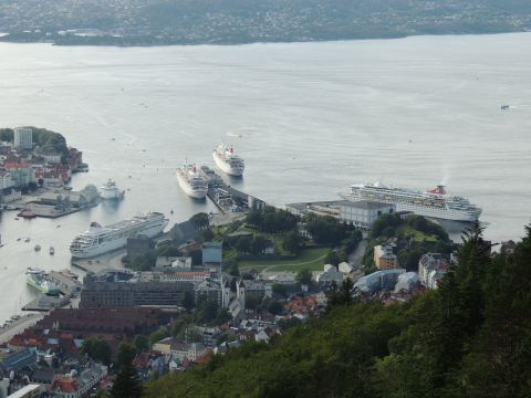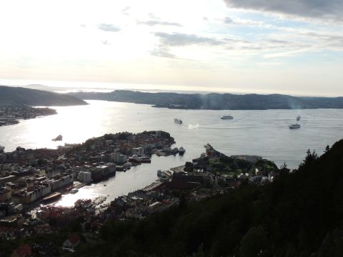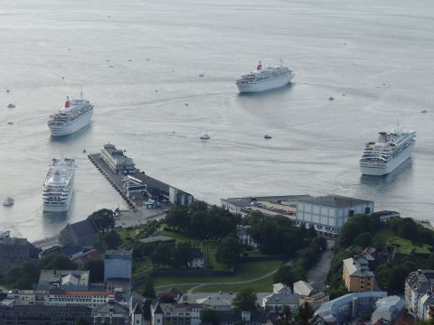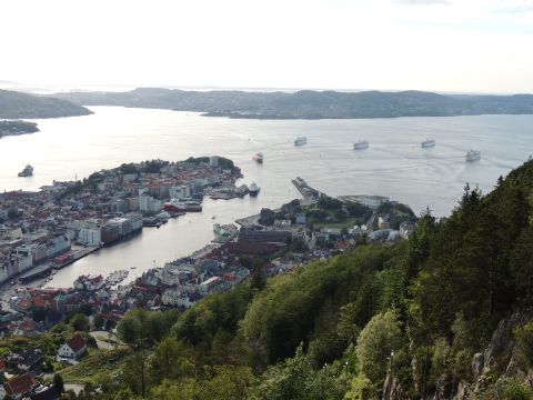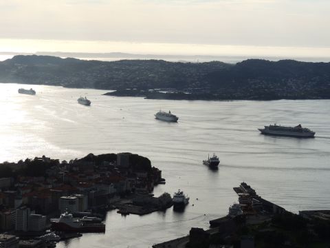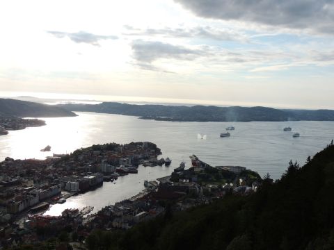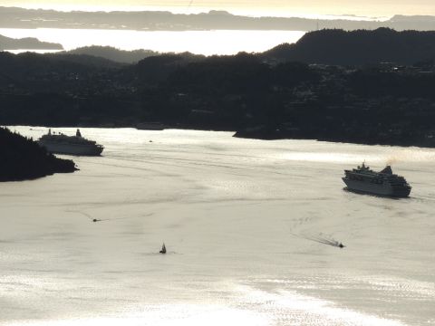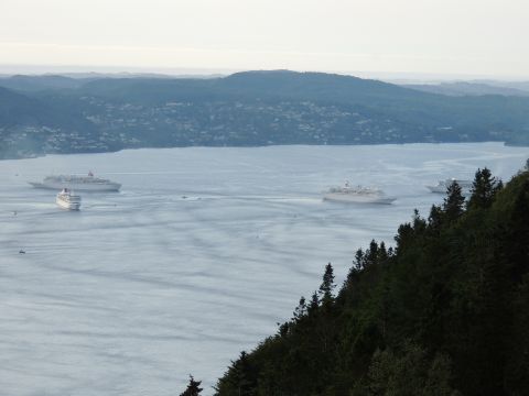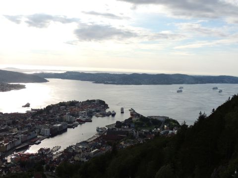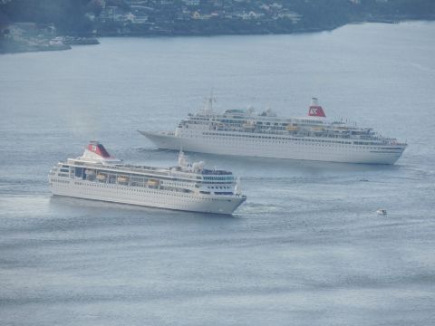 | After a couple of hours back at the hotel to charge batteries, it was time for get ready for the departures and up to Fløyen via the Fløibanen funicular. I have a fear of heights so am very proud of myself for doing that. A few people were there for the ships but most wanted the view then left. It clouded over but thankfully there was no rain. They were all due off at 6pm, Boudicca casting off first followed by Balmoral, Black Watch and Braemar with them sailing abreast to around 1.5 nautical miles north of Skolten. One bloke had gone by this time, whether to get another view or because he thought that was it, I have no idea. I lost sight of Balmoral for a while due to trees but she re-emerged as they turned to make the diamond formation behind a fireboat. Braemar then led them out, Boudicca, Black Watch and Balmoral behind. The flagship blew her horn as she passed the port of Bergen as one by one they sailed towards the Askøy Bridge about 12 hours after arriving under it. |