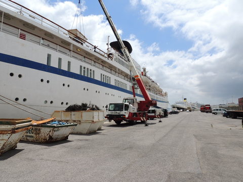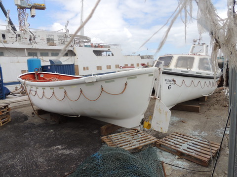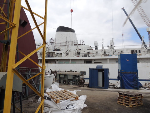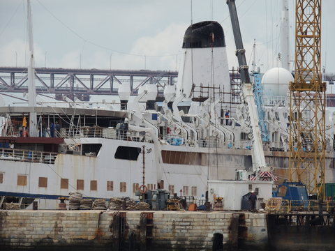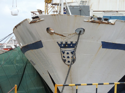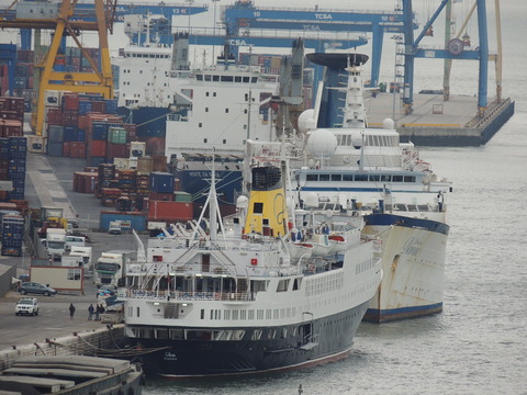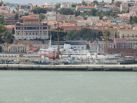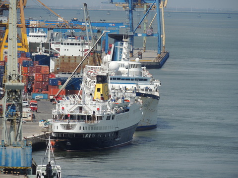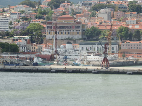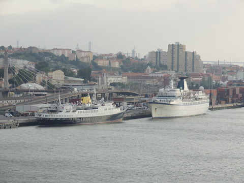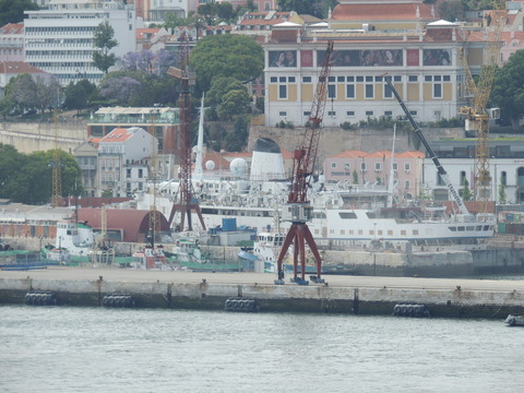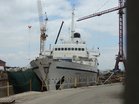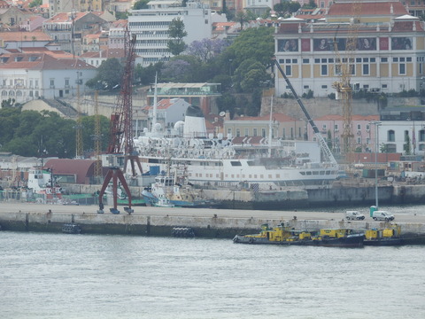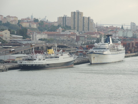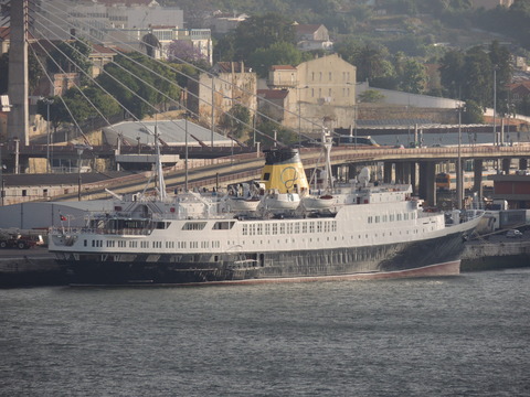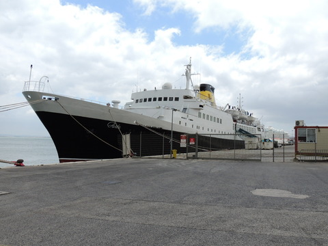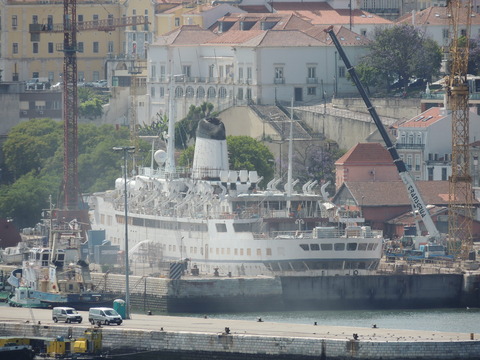 Meanwhile, Princess Danae had been arrested in Marseilles along with Athena. She returned to Lisbon in May. I had only seen her in 2007 down in Madeira but she was adorable so I was glad to renew my acquaintance. She would be third in drydock and, although she was still showing Princess Danae on her bow, she had been officially renamed and transmitted on the AIS as Lisboa. And so we come to who was currently being worked on - Funchal! The 9,824grt beauty began life in 1961 for Empresa Insulana de Navegacao going from Lisbon to Madeira and the Azores, expanding to other ports until turned into a full time cruise ship in 1973, replacing her troublesome boilers with diesel electric engines. Due to other changes her tonnage dropped to 9,563grt. When her owners got into financial difficulty, they merged with Cia to become Cia Portuguesa de Transportes Maritimos and she was given a new livery until that was liquidated in 1985 and she was sold to Great Warwick Inc of Panama and reflagged. She eventually became fully owned by Arcalia Shipping and operated her under the Classic International Cruises banner from 1995 and reregistered in Portugal during the 1997 refit to bring her up to SOLAS standards.