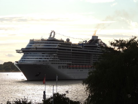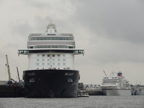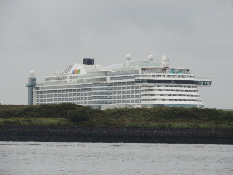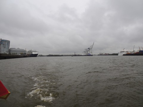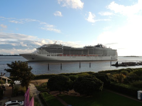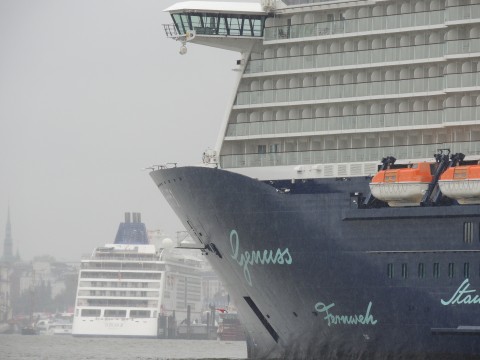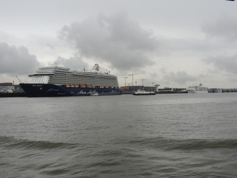 | MSC Preziosa finally arrived early evening to be part of the event. Her itinerary had been changed from an overnight in Hamburg to docking at 11.59pm due to AIDAprima being in her berth. By the time she appeared, it had finally stopped raining. |