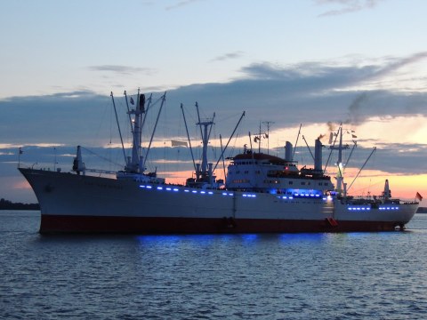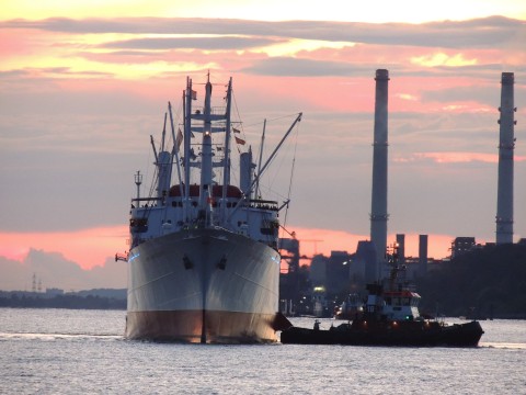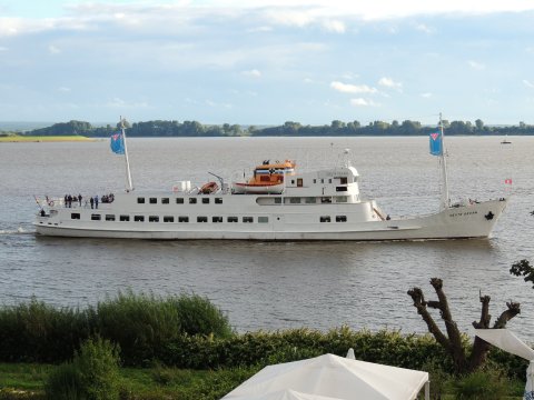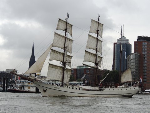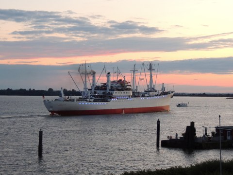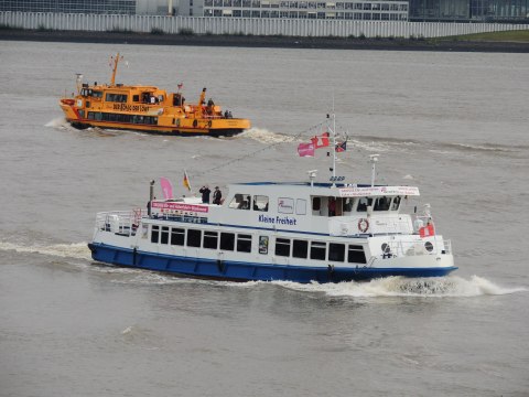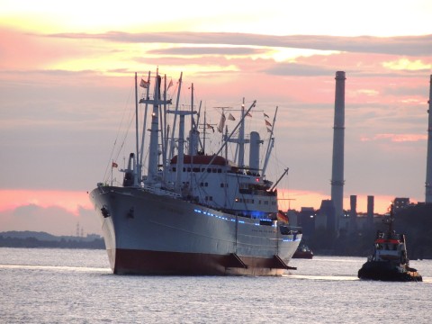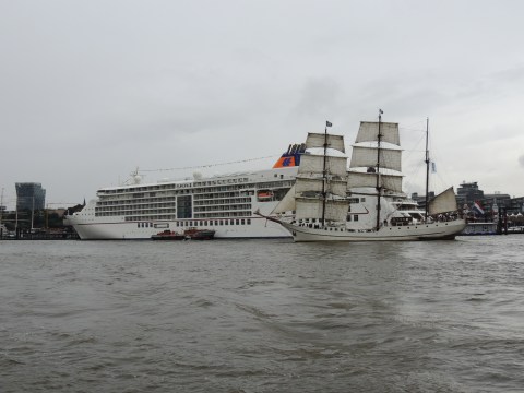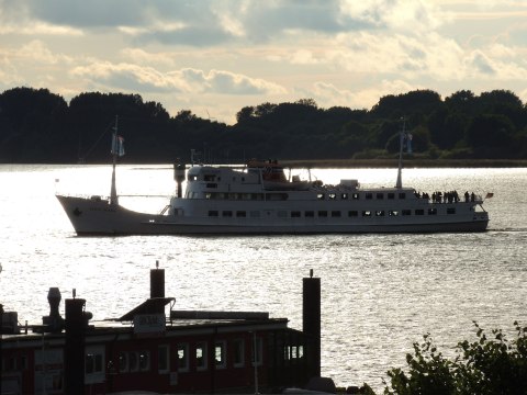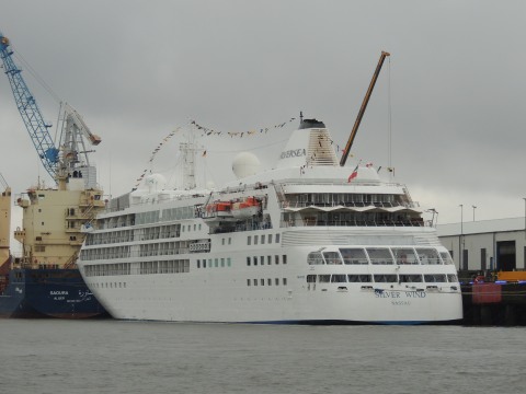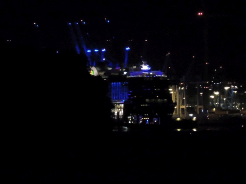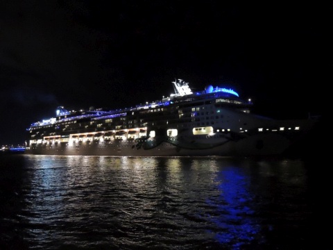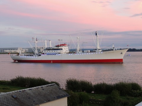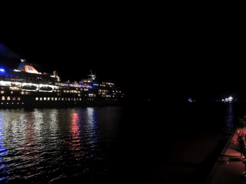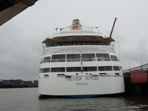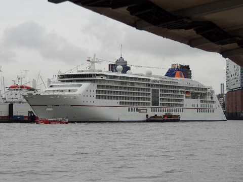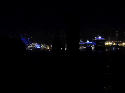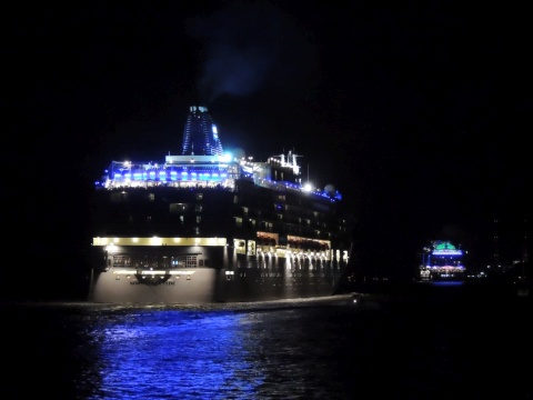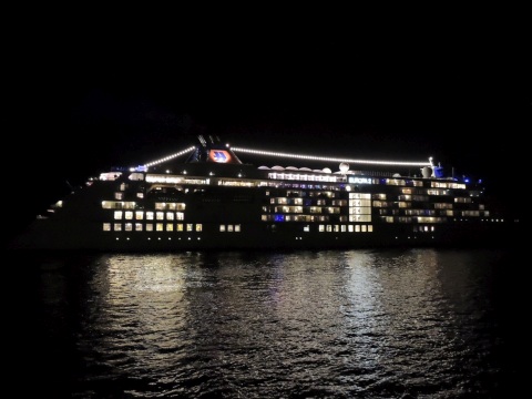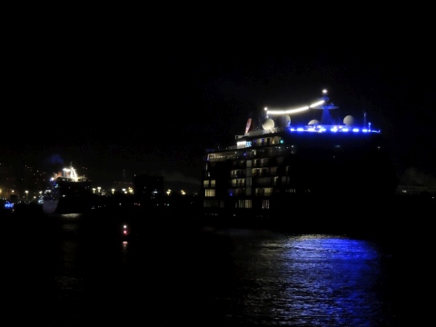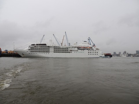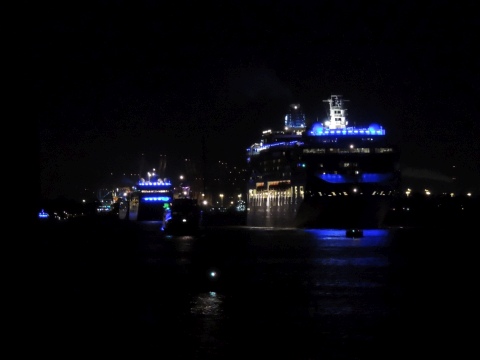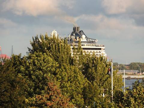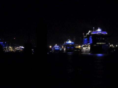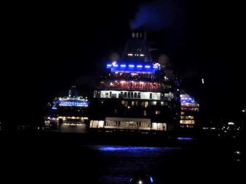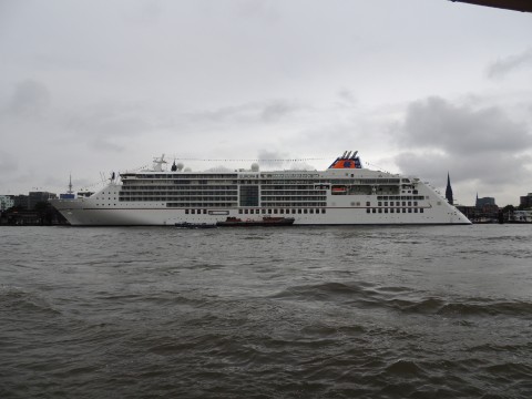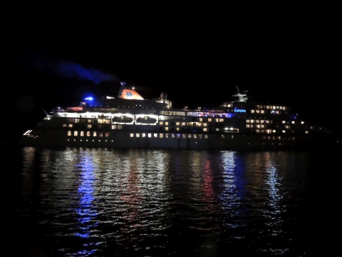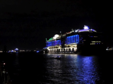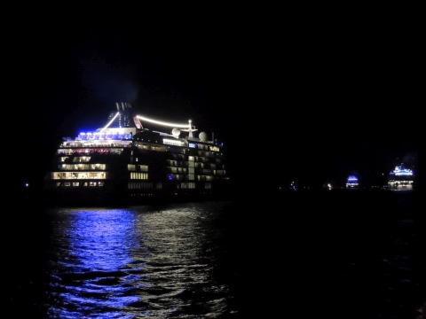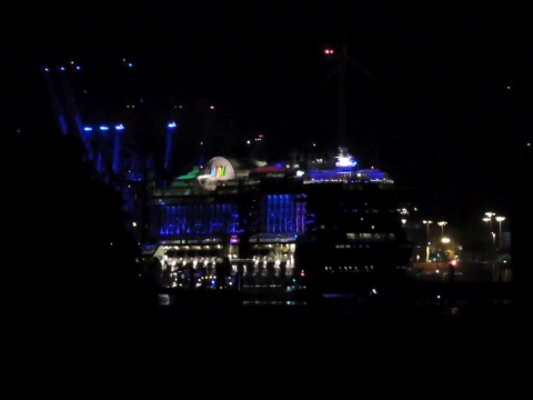 | The main event with fireworks was in the city centre but I wasn't physically well enough to be among all the crowds standing for hours so we waited near the hotel. Despite there being seven ships for Hamburg Cruise Days, only four were in the parade. Silver Wind and MSC Preziosa weren't sailing until the following day while Mein Schiff 3 had to withdraw at the last moment when a rope became caught around a propeller. She left before 6am the next morning. The museum ship, Cap San Diego, tootled past before returning to the city centre. AIDAprima led the way followed by Norwegian Jade, Europa 2 and Europa. Only Europa 2 blew her horn as she passed. |