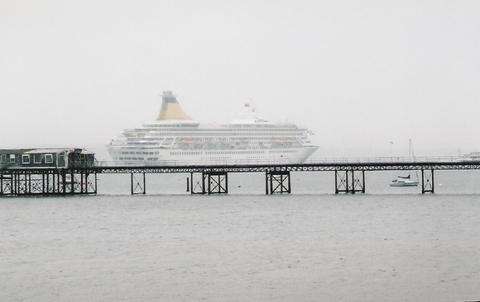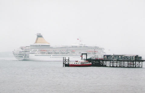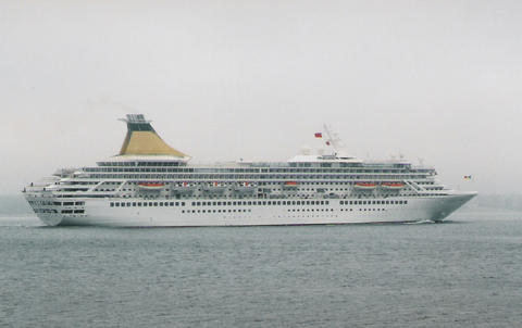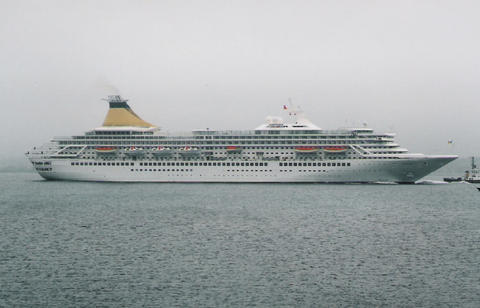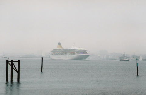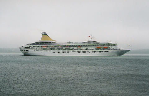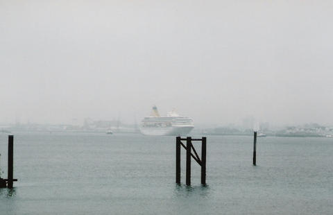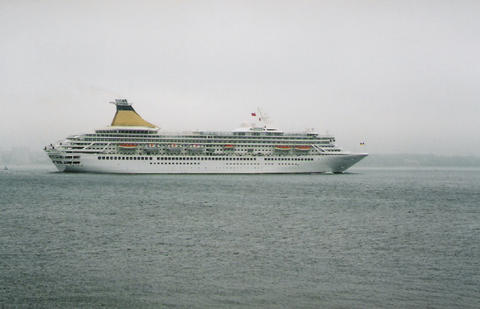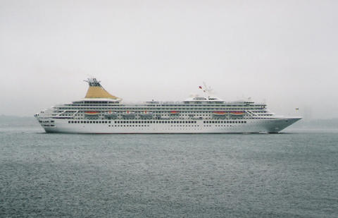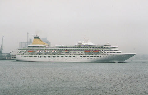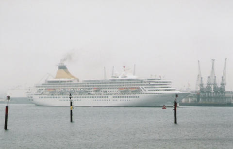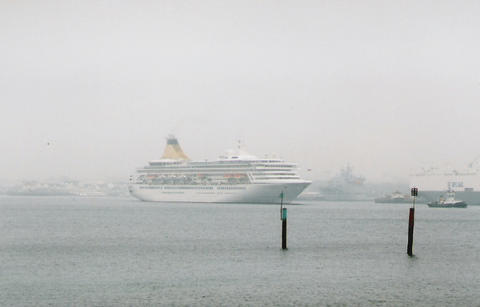 The impending arrival of the former Royal Princess (I) from Bremerhaven was much delayed. She was originally listed as arriving on the 13th June 2005, then the 14th but she finally docked around 3am on the 16th, which was the same day as her naming ceremony. There was absolutely no mention of rain or mist in the weather forecast but that's what we got. While Royal Princess's Godmother had been the late Diana, Princess of Wales, her new Godmother as Artemis was to be the British actress Prunella Scales. But they have kept the royal connection as I understand Artemis is Greek for Diana. She was meant to sail at 12.30pm to Cowes for the first UK naming at sea but was still being loaded up. The rain stopped and the fog slowly began to lift. We think she cast off around 1.10pm but it was difficult to see. Her horn sounded three times which is the only way we knew anything was happening up that end. As she got near us, escorted by a tug, the heavens opened again.