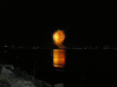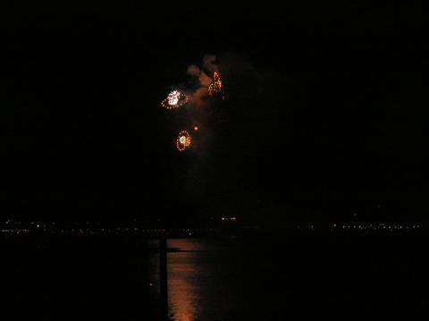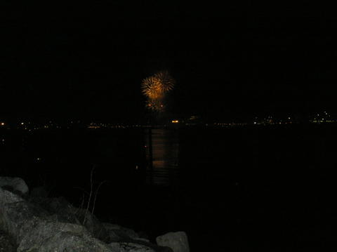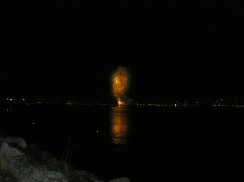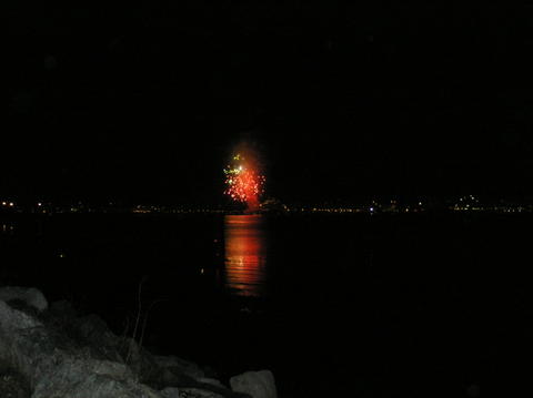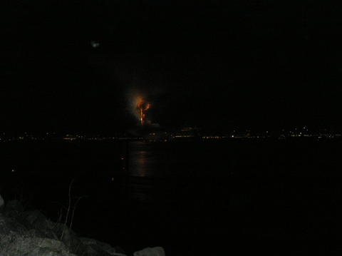 | Despite the schedule saying Queen Victoria would set sail at 5pm, with the fireworks due at 5.10pm there was no way she would. It was absolutely freezing by now and hundreds turned out lining the marina. Some irritating people decided to plonk themselves on the rocks in people's way and we weren't the only ones fed up with the father standing, sitting, standing, sitting. Queen Victoria's horn had sounded just after 4.15pm for muster and it was peculiar again. When she finally cast off and blasted again at 5.15pm it soundedlike QM2's but a deeper tone. There's just no consistency with it. Aurora blasted back. She moved away from City Terminal, her home since arriving Friday morning and backed up. Some people behind thought she was going to turn but thought the only turning circle was by Ocean Dock. One even said they'd turned her that day! The fireworks started twenty minutes late and lasted ten minutes. As they lit up the Southampton sky, Queen Victoria very slowly made her way forward. |