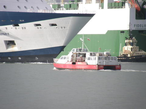 | How we loved this ship! Not only had the rain stopped and wind eased, but we suddenly became quite hot when the sun came out through a break in the cloud. How different it was on the ferries and us to where Summit was, but not for long. |