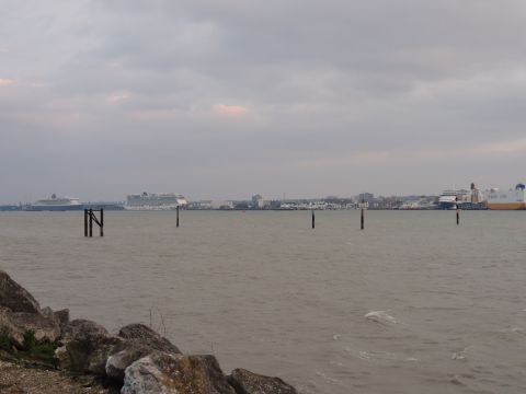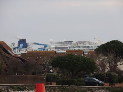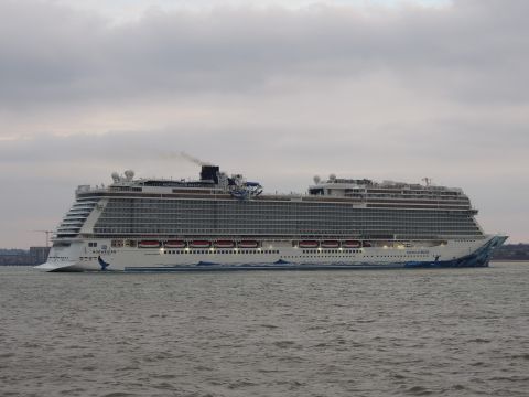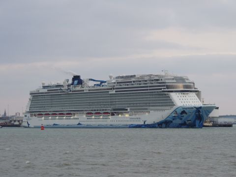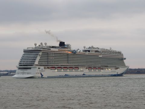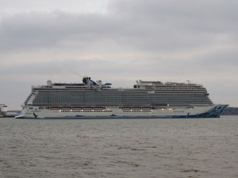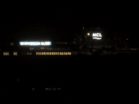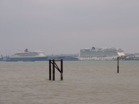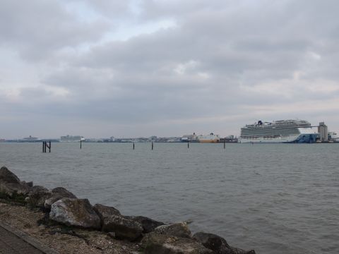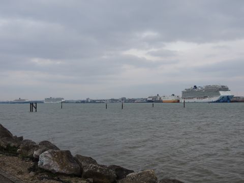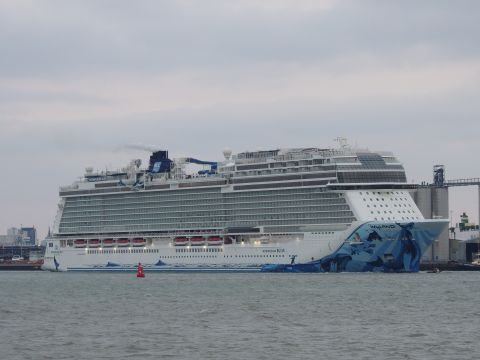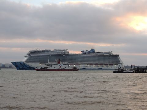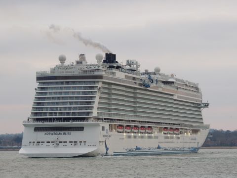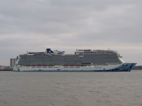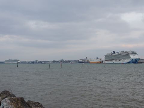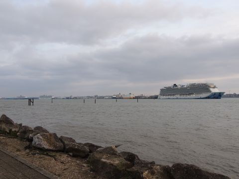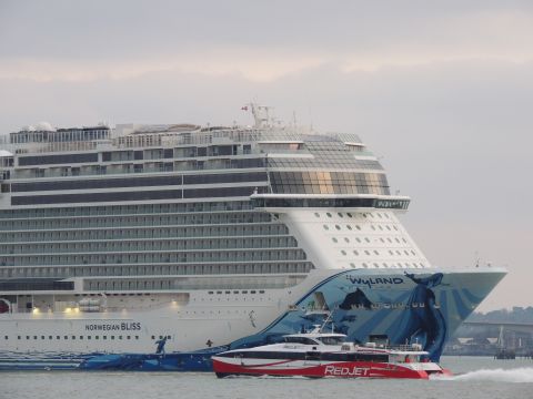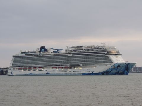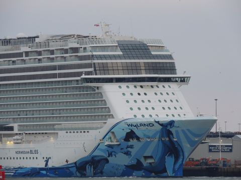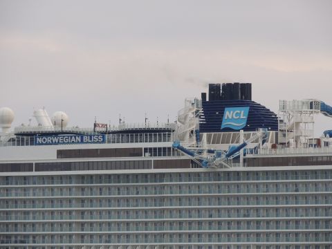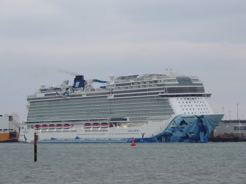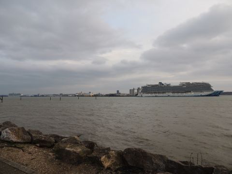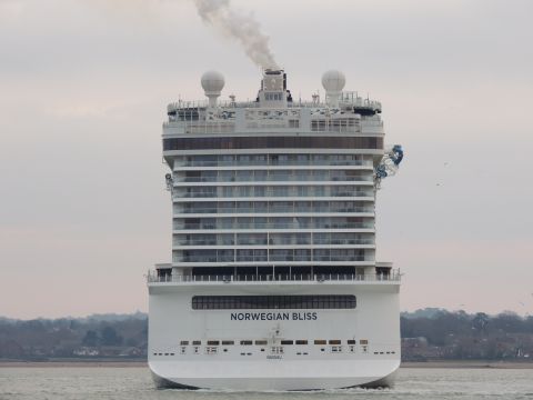 | Due to the Coronavirus pandemic, all cruise lines suspended operations from various dates in March 2020. We were still getting our local waifs and strays (except Azura who had gone to Newcastle for lay-up) plus Royal Caribbean and Holland America Line. On the 13th February 2021, I made my first freezing foray to the marina (which thankfully hadn't closed to the public during the current lockdown) for Norwegian Bliss, which had been hanging around the south coast for several months. She was coming to transfer crew to Encore for repatriation. Mary had arrived on the 9th, originally in 38/9 but had to make way for Bliss so was moved on the 10th to 104. Vicky had been in since the 11th. It was bitterly cold, windchill -8c in the wind. With reduced buses, I just made it as she approached the pier while I sat down. |